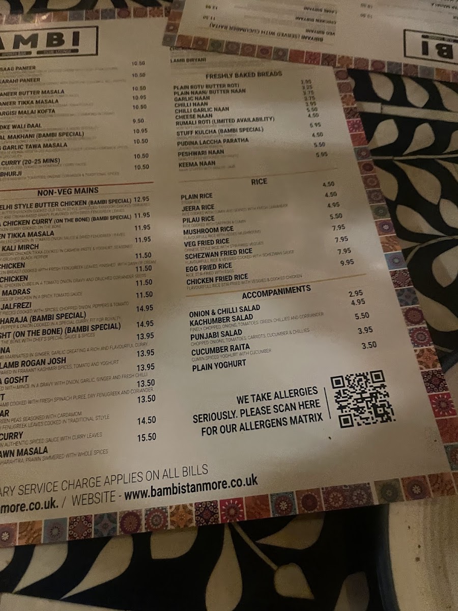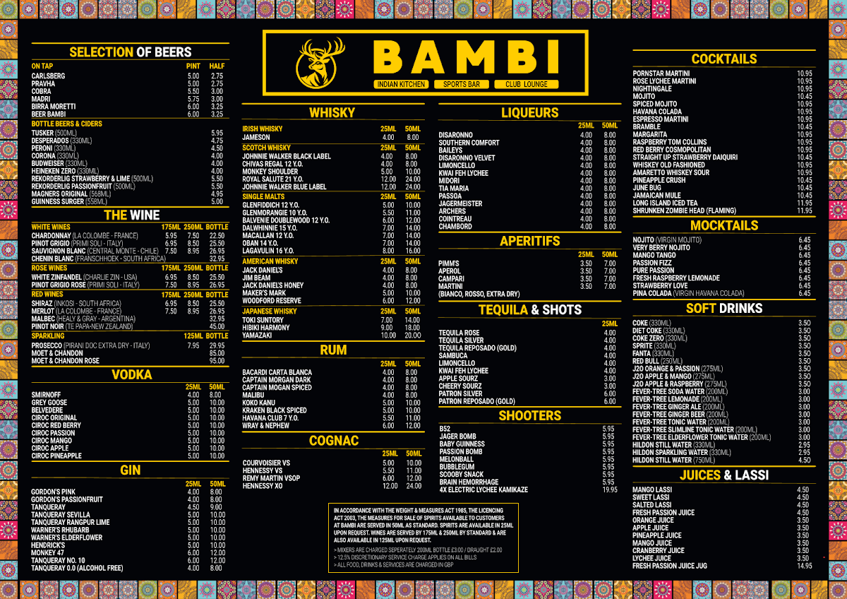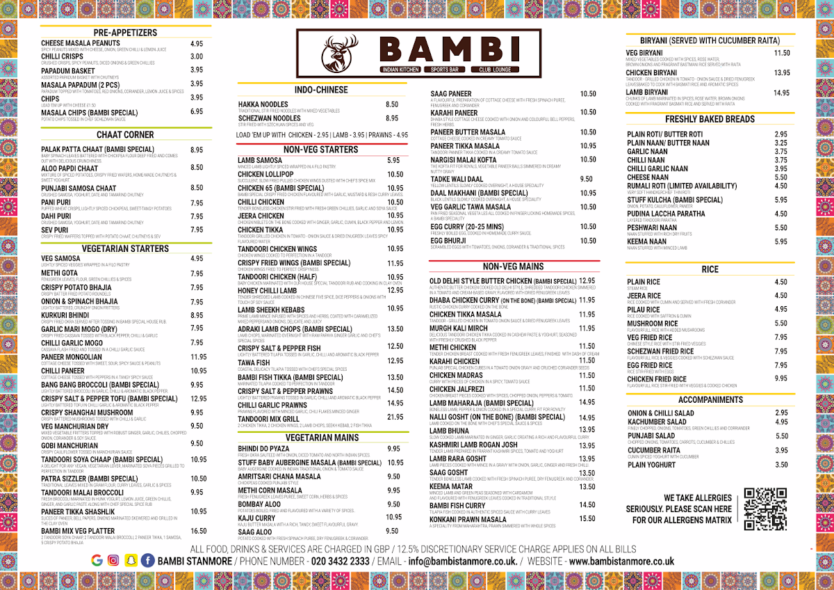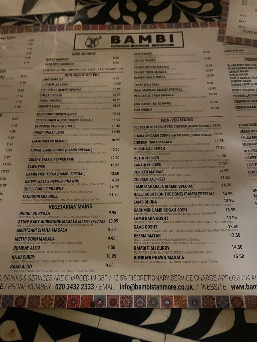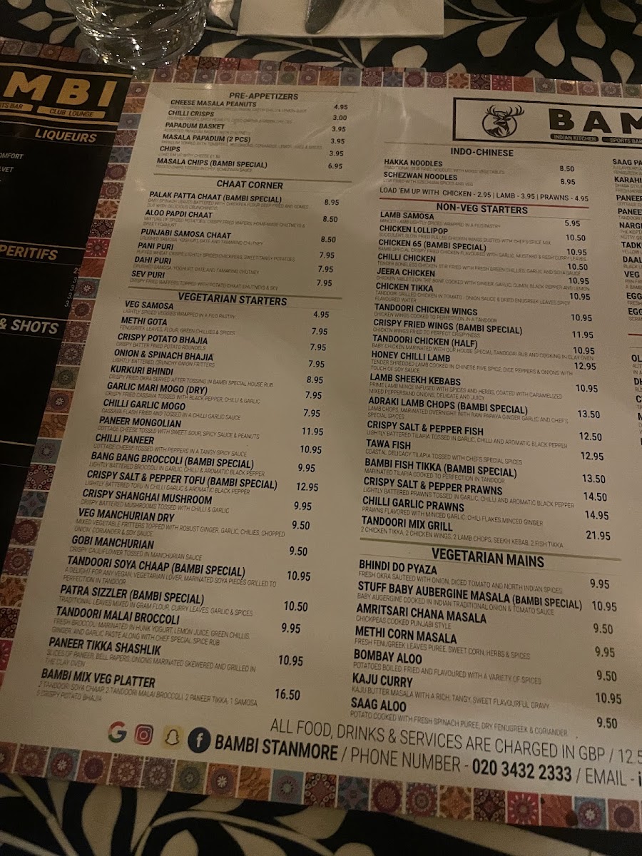 The menu at Bambi Stanmore offers a vibrant mix of classic Indian flavors and inventive twists, balancing traditional dishes with refreshing drinks. Starters like Lamb Samosa and Tandoori Wings showcase a crisp, well-spiced approach that immediately sets the tone, while mains such as Dal Makhani, Jeera Chicken, and Malai Kofta deliver comforting depth and richness, each enhanced by perfectly baked Garlic Naan or Butter Naan. Vegetables are given equal attention, with dishes highlighting Broccoli, Peppers, and Potatoes prepared to retain their natural flavor and texture. For a lighter accompaniment, Plain Rice serves as a neutral canvas that allows the spices to shine, complemented beautifully by a dollop of tangy Chutney. Drinks such as a chilled Beer, a tropical Pinacolada, or a sophisticated Clover Club Cocktail round out the experience, offering both refreshment and a touch of indulgence. The menu demonstrates a careful balance between familiar comfort and thoughtful creativity, making every bite and sip feel intentional and satisfying.